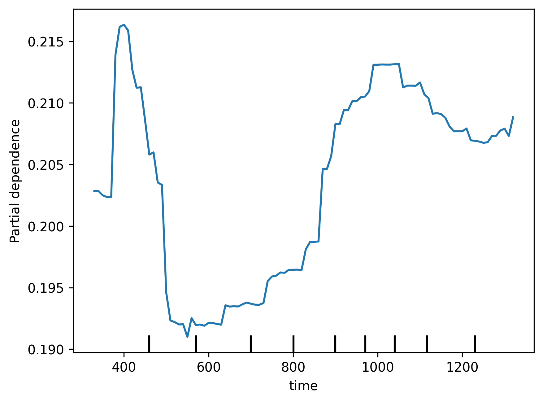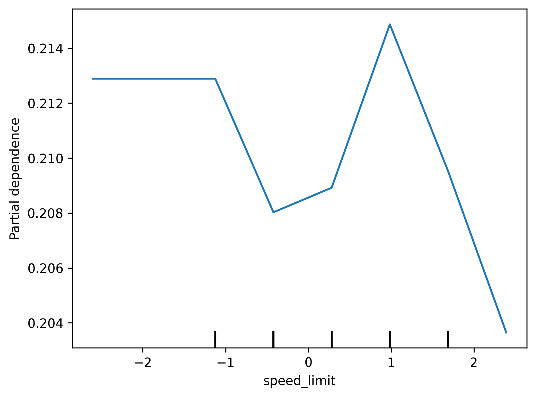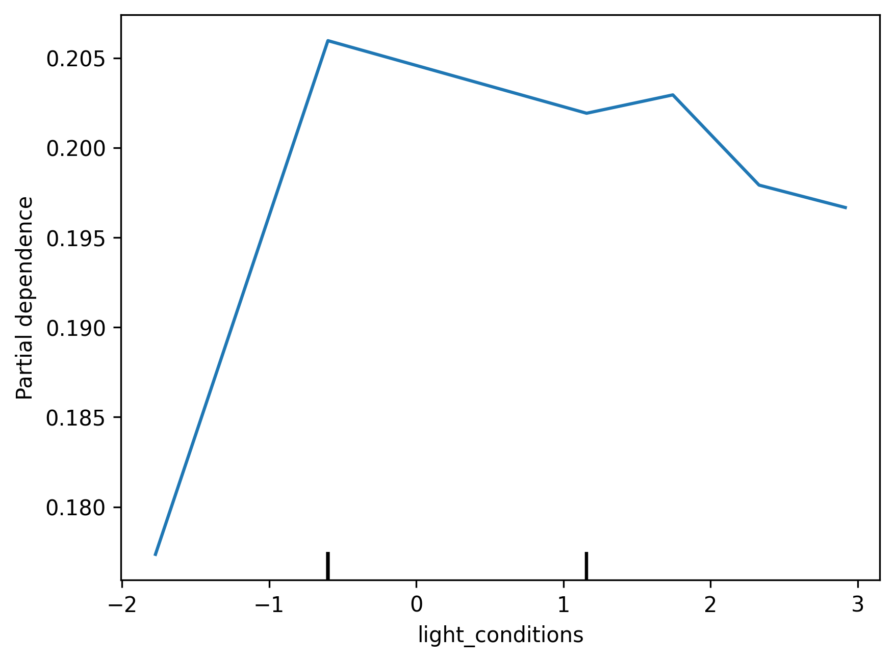 Partial Plots help explore the relationship between specific variables and a model's predictions. We can use them to help inform us how a particular feature shapes a model's decisions when it fluctuates. We have generated partial plots for a few numerical features in the dataset, such as time of day, to see how they impact collision severity. Interestingly, we find that even though the model does not consider some of these features very important, as seen in the Feature Importance chart, it seems to reflect reasonable relationships between said variables. For example, the model seems to recognise that there are less serious collisions from 5-8am, given a general decrease in road traffic. However, we also note that some parts of the plots seem to have erratic behaviour due to lack of training data.